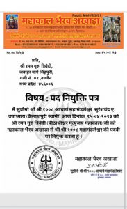 इसके लिए उन्होंने मीडिया को बकायदा महाकाल भैरव अखाड़े से जारी नियुक्ति पत्र भी जारी किया है। नियुक्ति पत्र के मुताबिक महाकाल भैरव अखाड़ा महाराष्ट्र के ठाणे में है। जिसके सुप्रीमो आचार्य महामंडलेश्वर सुरेशचंद्र ए. उपाध्याय हैं। हालांकि अखाड़ा परिषद के अध्यक्ष रवींद्रपुरी महाराज का कहना है कि देश में सिर्फ 13 सनातनी अखाड़ों को मान्यता है। इन 13 अखाड़ों में महाकाल भैरव अखाड़ा नहीं है।